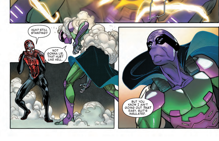 O herói dá um tiro nele, derrubando-o com o movimento, mas em vez de desabilitar a armadura e derrotá-lo, seu tio se levanta e diz, apesar da explosão doendo, que seu traje é isolado para proteção. É uma defesa que Miles não esperava.