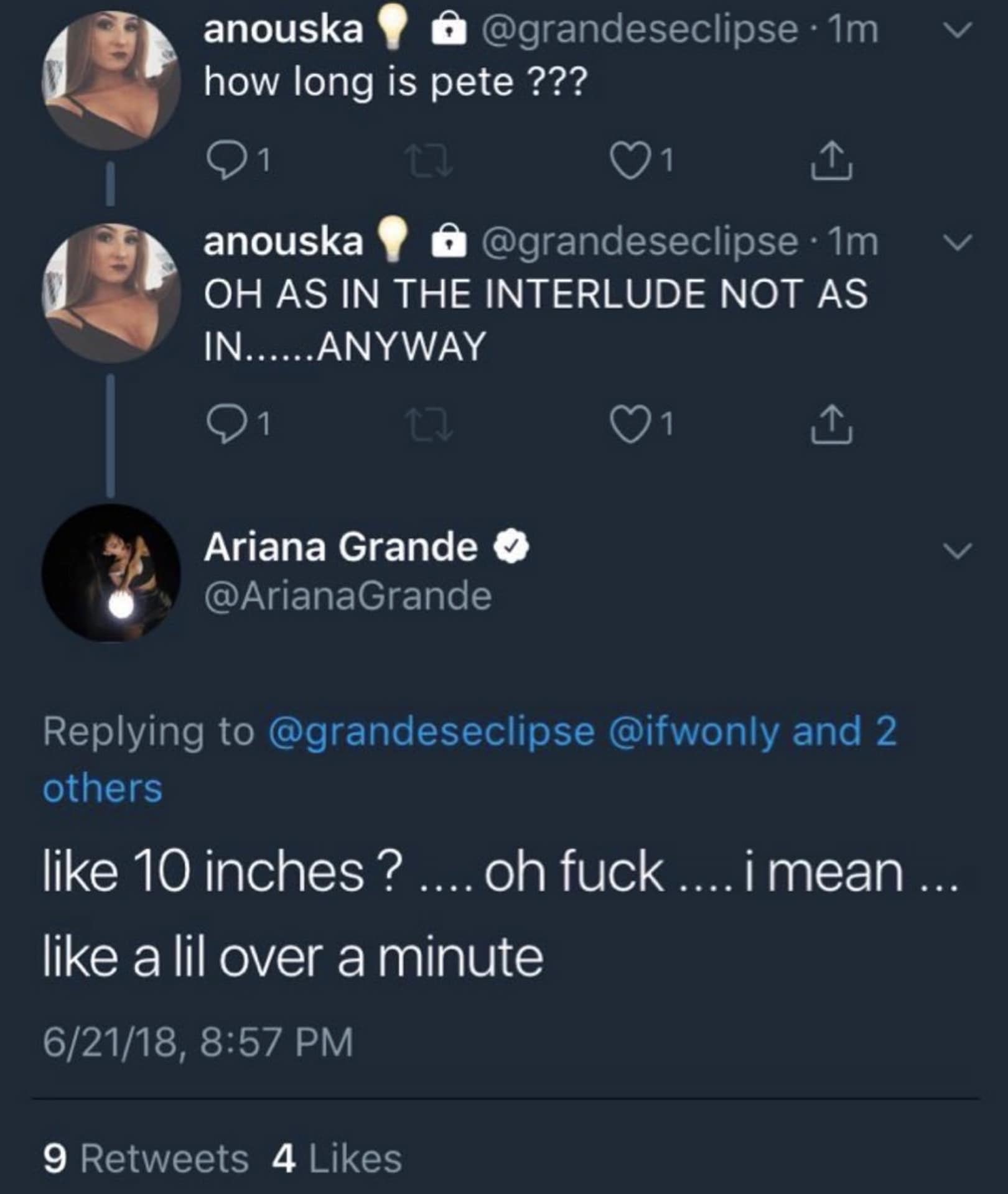 Para a surpresa de muitas pessoas, a cantora respondeu. Ela já deletou o tweet, mas ele dizia: “Tipo uns 25 cm (10 inches)? Oh, p**ra… quer dizer… um pouco mais de um minuto”.
