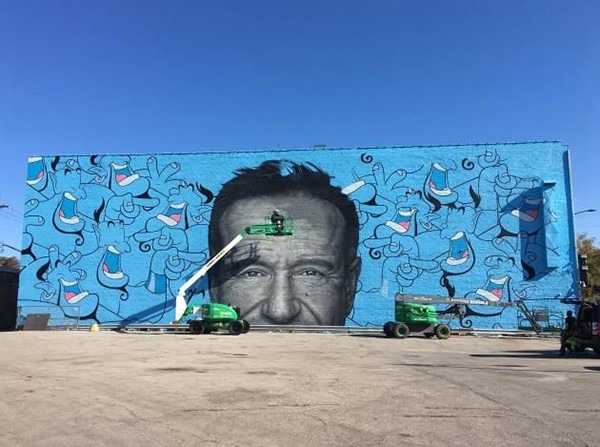 Artistas norte-americanos utilizaram o espaço de um grande muro para pintar o rosto do ator. Ao redor, desenharam diversas imagens do personagem do ator em Aladdin, o Gênio. A ideia é mostrar como Robin Williams sofria com depressão, mas ninguém percebia, ainda mais quando o astro interpretava personagens tão animados.