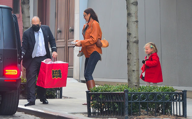Já a filha estava bastante sorridente, de casaco vermelho olhando para uma grande sacola da loja de brinquedos FAO Schwarz.