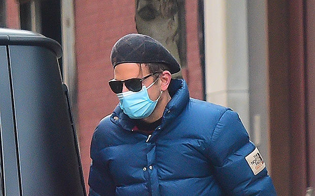 Cooper vestia um casaco azul, junto de óculos escuros e máscara. Irina Shayk de jaqueta mostarda, calça jeans e bota.