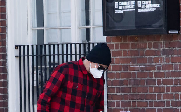O astro de Nasce Uma Estrela pode ser visto, nas fotos, vestindo uma camisa listrada vermelho e preta, calça marrom e botas pretas. Ele ainda veste um gorro preto, óculos escuros e máscara.