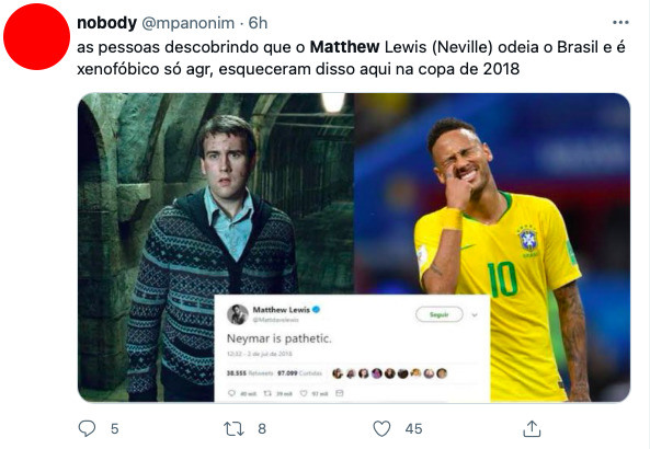 Essa não é a primeira vez que o ator de Harry Potter faz publicações sobre o Brasil. Em 2018, Matthew Lewis escreveu durante a Copa do Mundo da Rússia que Neymar era patético”.