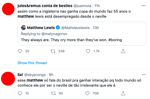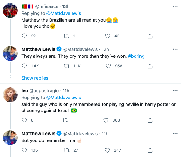 Matthew Lewis, o Neville de Harry Potter, voltou a discutir com fãs brasileiros por causa de futebol. Após chamar os torcedores do Brasil de “chorões”, o ator recebeu críticas e passou a bloquear internautas no Twitter.