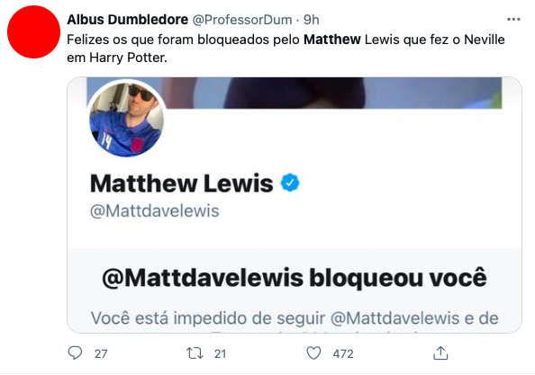 Dessa vez, o ator de Neville não parece ter mantido o mesmo tom. No Twitter, internautas mostraram que foram bloqueados.