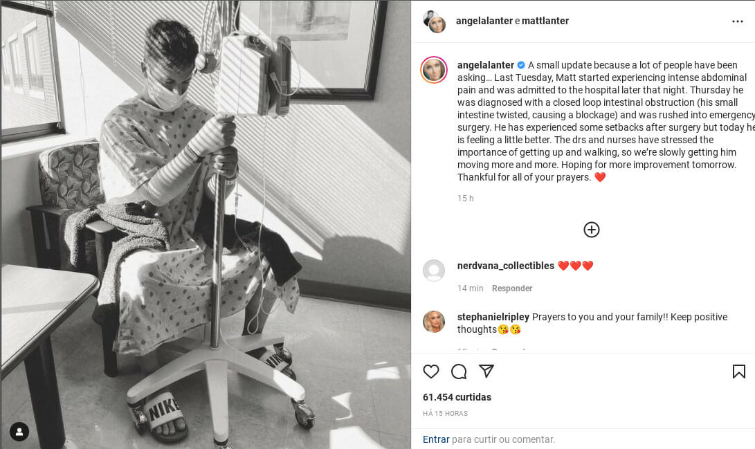 A esposa de Matt Lanter compartilhou por meio do Instagram que ele sentiu uma intensa dor abdominal em 22 de março e teve que ser internado em um hospital.
