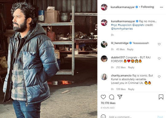 “Raj, não mais”, escreveu o ator. A legenda também mostra que a imagem é da série Suspicion, nova atração do famoso para Apple TV+.