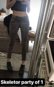 Sarah tem 27 anos e 1,57m de altura, e compartilhou uma foto com a legenda “Parte 1 da Esqueleto”. Seu percentual de gordura corporal de 18%, sua porcentagem de músculo de 17% e seu IMC de 16 foram revelados também.