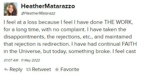 “Sinto-me perdida porque sinto que faço O TRABALHO há muito tempo, sem reclamar. Absorvi as decepções, as rejeições, etc., e afirmei que a rejeição é um redirecionamento. Eu tive FÉ contínua no Universo, mas hoje, algo quebrou. Eu me sinto rejeitada”, continuou.
