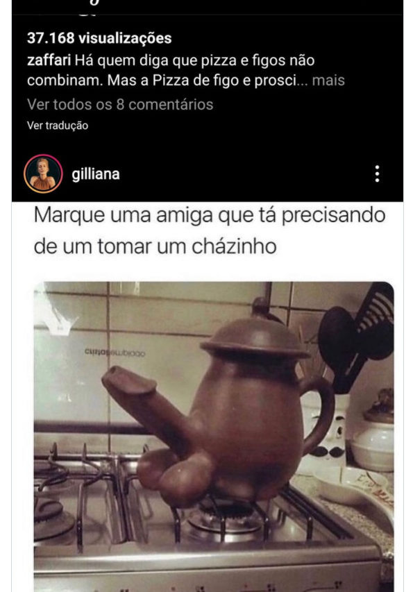 O meme diz: “Marque uma amiga que tá precisando de um tomar um cházinho” (sic). Vemos um bule marrom com formato bastante sugestivo.