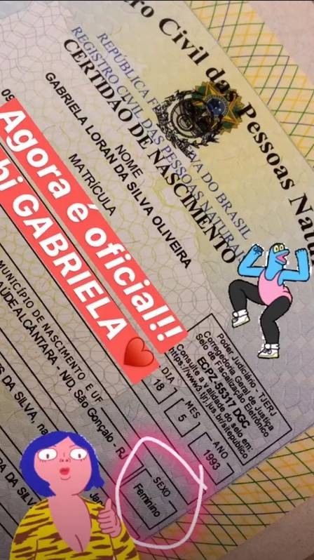 A atriz trans Gabriela Loran, que atualmente participa de Malhação na TV Globo, divulgou em suas redes sociais que conseguiu alterar seu nome na certidão de nascimento para Gabriela, escrevendo “Agora é oficial: Gabriela”.