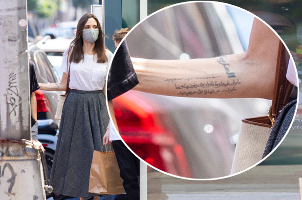 Angelina Jolie fez uma nova tatuagem e ela pode ter ligação com Brad Pitt. O flagra foi feito pelo Page Six, que revelou uma imagem de uma nova frase escrita no antebraço da famosa.