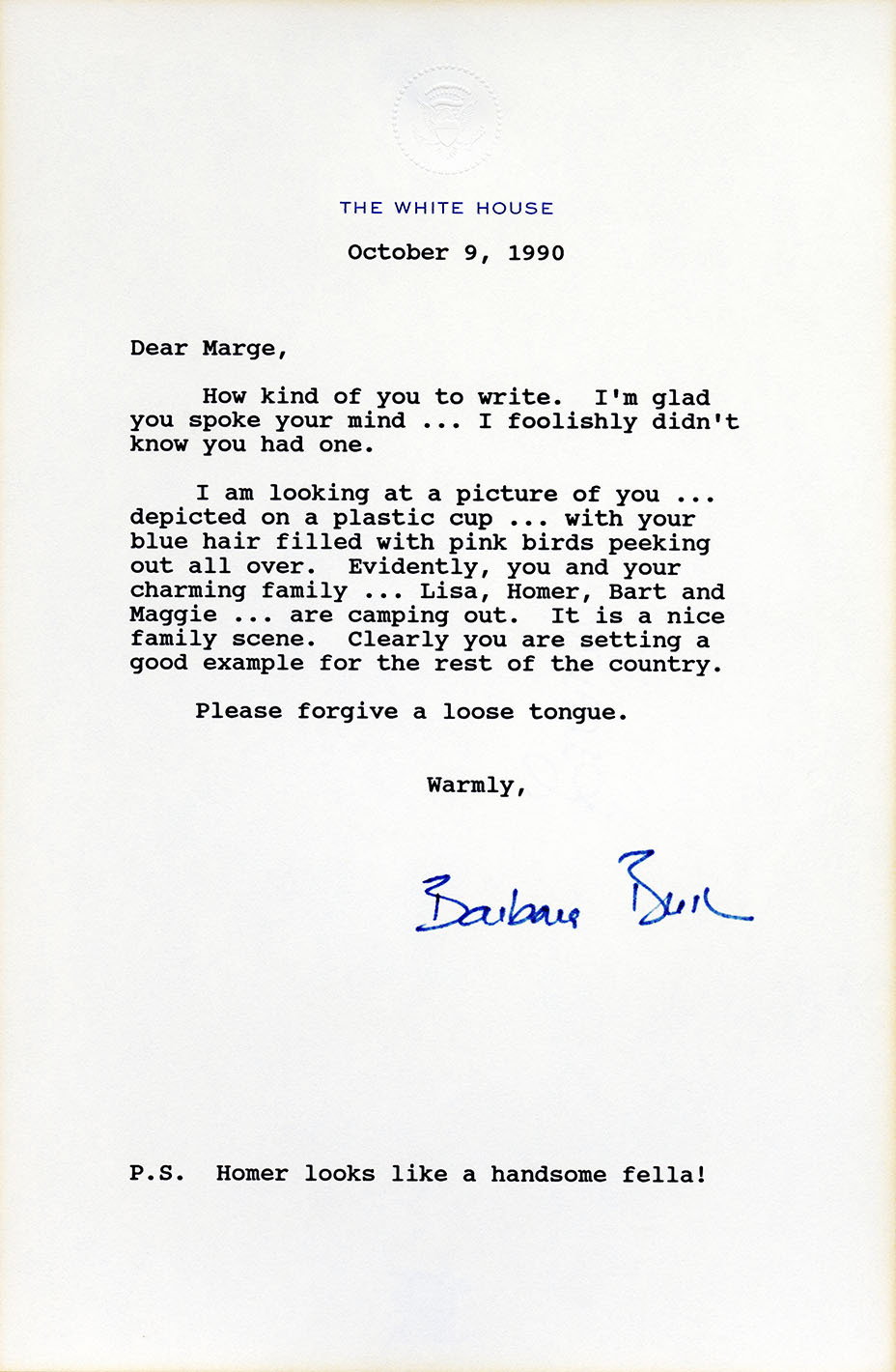 Acontece que, após comentar em entrevista que ela e seu marido, George H.W. Bush, achava Os Simpsons “a coisa mais estúpida que eles já viram”, a ex-primeira dama recebeu uma carta “escrita” por Marge, a matriarca da família.