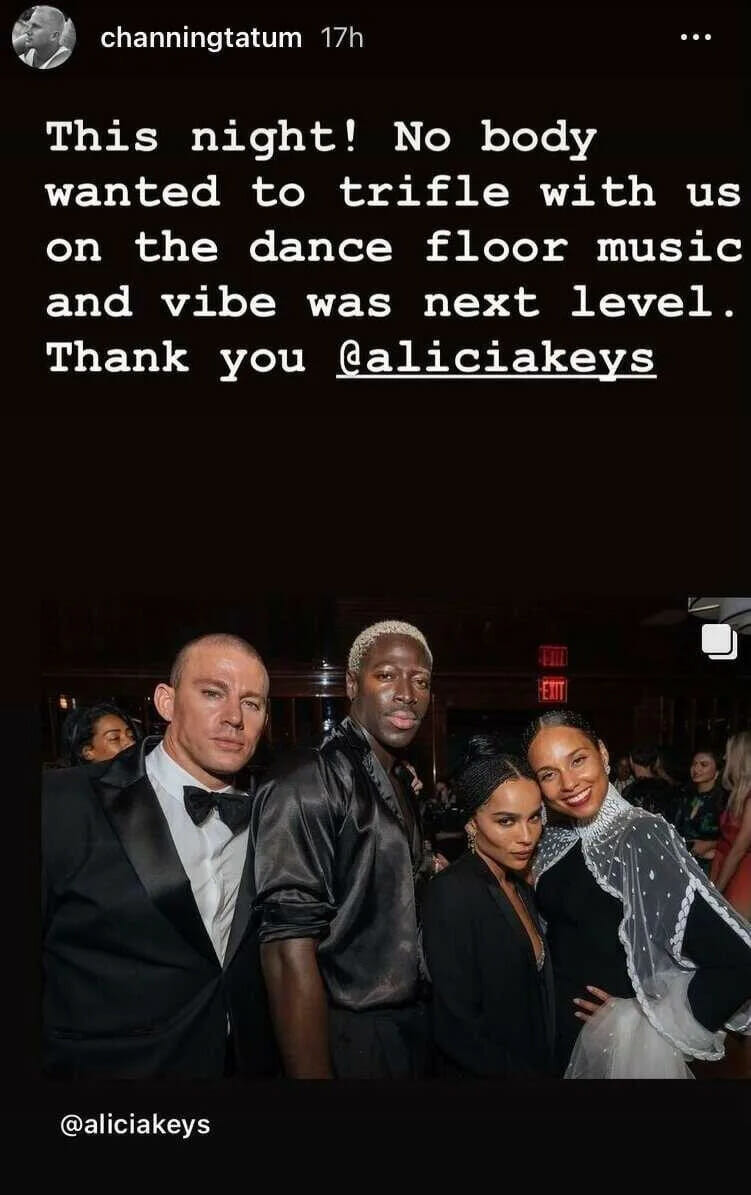 Na imagem, compartilhada nos Stories de Channing Tatum, o suposto casal aparece junto com Alicia Keys e Moses Sumney. O ator escreveu: “Ninguém nos superou na pista de dança e a vibe foi de alto nível. Obrigado, Alicia Keys.”