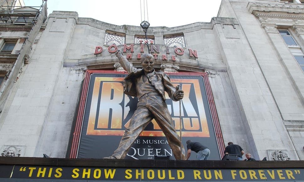 A estátua em fibra de vidro em pose icônica ficou por 12 anos do lado de fora do Dominion Theathre em Londres, enquanto a exibição do musical We Will Rock You ainda acontecia.