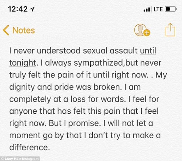 O Daily Mail conseguiu um print da mensagem deixada por Hale nas redes sociais antes que ela apagasse: “Eu nunca entendi assédio sexual até essa noite. Eu sempre simpatizei, mas nunca realmente senti a dor até esse momento”, começa ela.