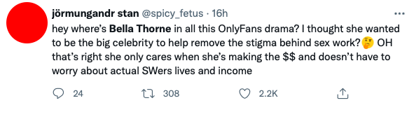 “Hey, onde está Bella Thorne sobre todo esse drama do OnlyFans? Eu achei que ela queria ser uma grande celebridade que ajudaria a remover o estigma por trás do trabalho no sexo? Oh, está certo, ela apenas se importa com o dinheiro e não com as vidas dos trabalhadores do sexo”, criticou mais uma.
