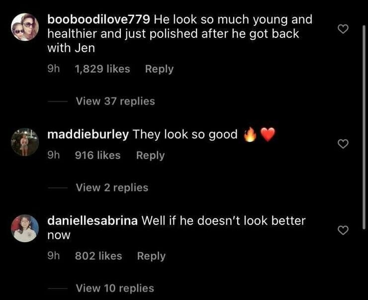 “Ele parece tão mais jovem e saudável, além de mais bonito depois de ter voltado com Jen”, comentou outra fã.