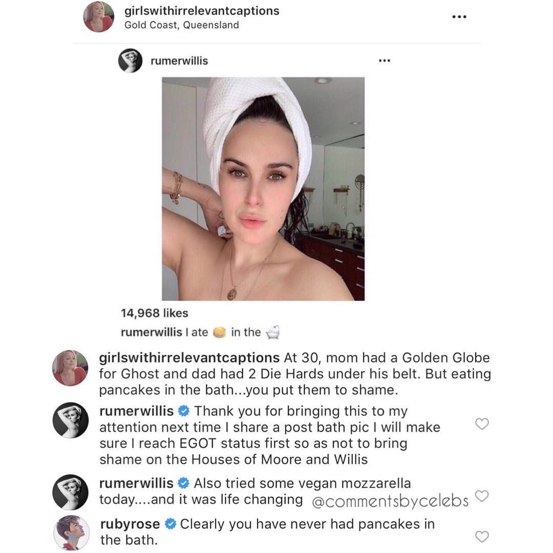Uma internauta quis fazer uma comparação de Rumer com os seus pais, os famosos Bruce Willis e Demi Moore. A crítica teria surgido porque a atriz de 30 anos disse ter comido panquecas na banheira.