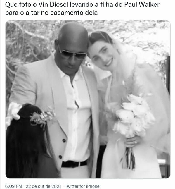 Vin Diesel levou a filha de Paul Walker, Meadow Walker, até o altar em seu casamento. Jordana Brewster, outra estrela de Velozes e Furiosos, também esteve presente na cerimônia.