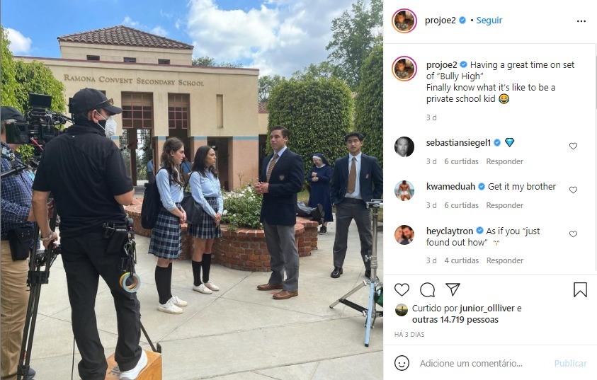 “Me divertindo no set de ‘Bully High’. Finalmente agora eu sei como é ser um garoto de escola particular”, escreveu o filho de Arnold Schwarzenegger na legenda da foto.