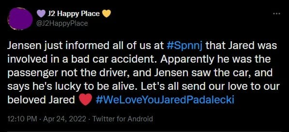 “Jensen informou a todos os fãs de Supernatural que Jared se envolveu em um grave acidente de carro. Aparentemente ele era o passageiro, não o motorista, e Jensen viu o carro, e diz que ele tem sorte de estar vivo. Vamos todos enviar nosso amor ao nosso amado Jared”, tuitou um fã.