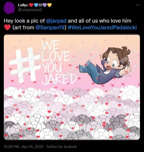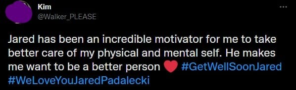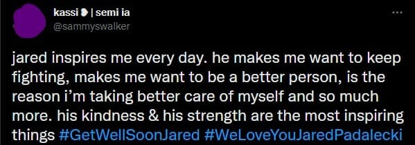 ”Jared me inspira todos os dias. Ele me faz querer continuar lutando, me faz querer ser uma pessoa melhor, é a razão pela qual estou cuidando melhor de mim. Sua bondade e sua força são as coisas mais inspiradoras”, tuitou outro fã.