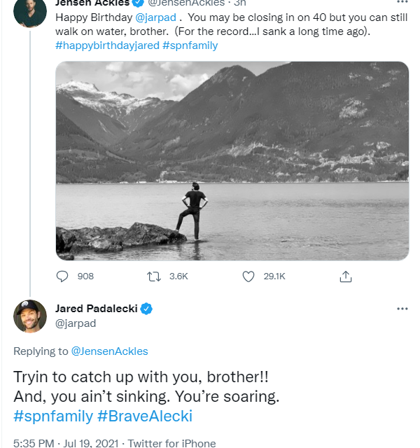 “Feliz aniversário, Jared Padalecki. Você pode estar chegando perto dos 40 anos, mas ainda consegue andar sobre a água, irmão. (Para deixar registrado… eu afundei há muito tempo”, escreveu Ackles, com uma foto de Jared Padalecki em um lago.