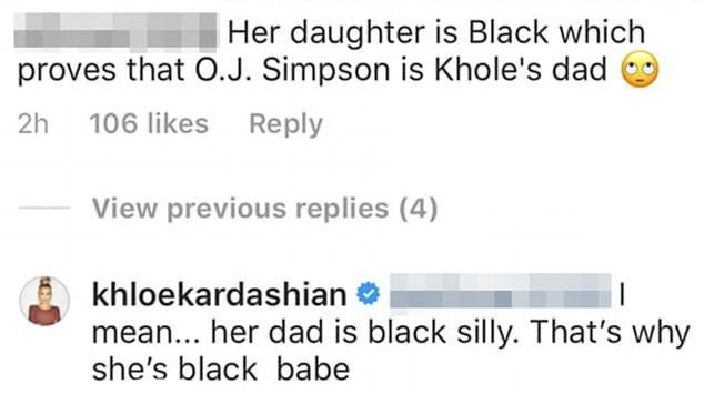 Na sábado (12), Khloé Kardashian publicou um vídeo de sua filha, True e deixou diversos fãs felizes. Entretanto, um seguidor resolveu se fazer de engraçadinho e disse que a filha da socialite era prova de que ela era filha de O.J. Simpson. “A filha dela é negra, é a prova de que ela é filha de O.J. Simpson”.