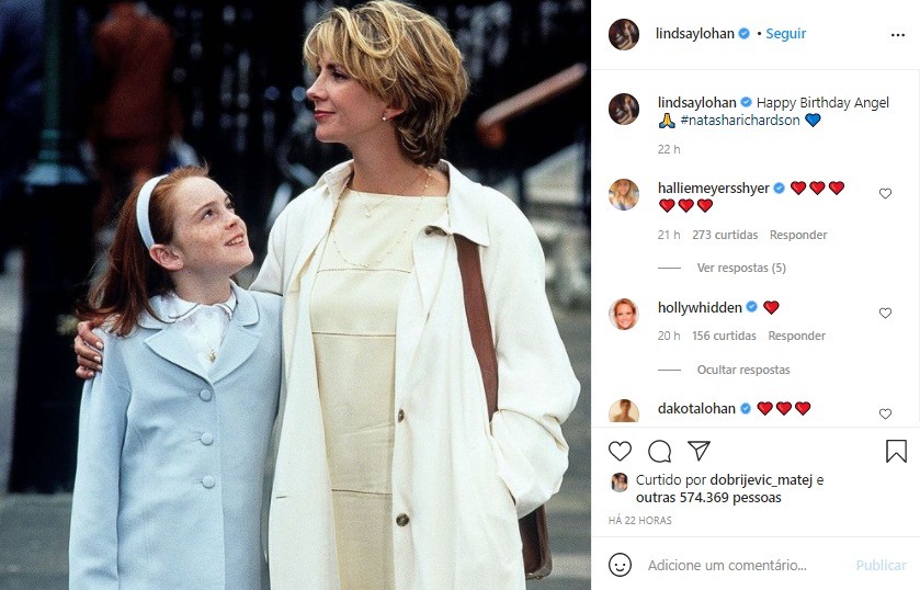 A atriz Lindsay Lohan homenageou Natasha Richardson, com quem contracenou em Operação Cupido, em 1998. No dia que marcaria o aniversário da falecida atriz, Lohan deixou uma mensagem nas redes sociais.