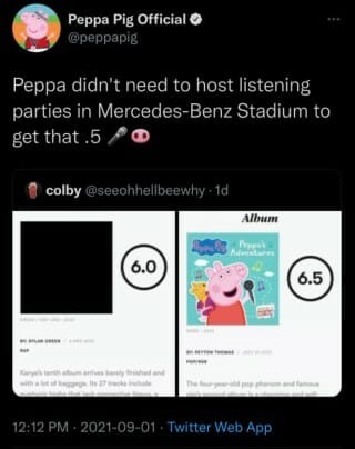 Peppa Pig debochou de Kanye West ao ter melhores avaliações que Donda, o novo álbum do rapper. A personagem usou a conta oficial do Twitter para mostrar as notas e zoar o músico.