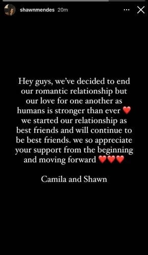 Um pronunciamento foi feito no Instagram de cada um. Camila Cabello e Shawn Mendes prometem continuar como melhores amigos após o término.