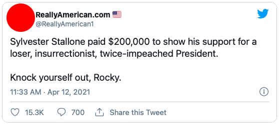 “Sylvester Stallone pagou US$ 200 mil para apoiar um perdedor, rebelde e um presidente com dois processos de impeachment. Saia daí, Rocky”, afirmou um internauta.