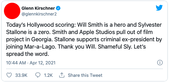 “Placar de Hollywood hoje: Will Smith é um herói e Sylvester Stallone é um zero. Smith e Apple tiraram um projeto da Geórgia. Stallone apoia um ex-presidente criminoso ao se juntar ao clube. Obrigado, Will. Vergonhoso, Sly. Vamos espalhar a palavra”, postou outro.