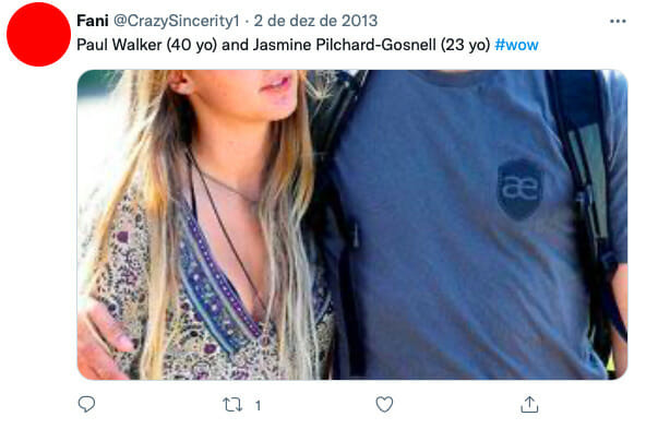 “Paul Walker (40 anos) e Jasmine Pilchard-Gosnell (23 anos). Wow”, publicou um.