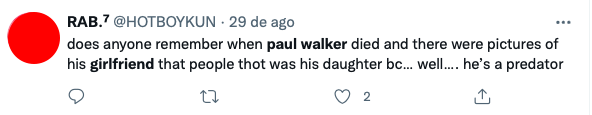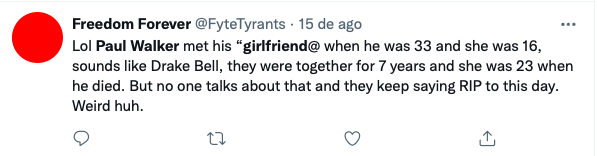 “Paul Walker conheceu a namorada quando ele tinha 33 e ela, 16. Parece como Drake Bell, eles ficaram 7 anos juntos e ela tinha 23 quando ele morreu. Mas, ninguém fala sobre isso e continuam dizendo Descanse em Paz. Estranho”, comparou outro com o ator de Drake & Josh, acusado de abusar de menor de idade.