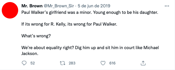 “Namorada de Paul Walker era menor. Mais nova o suficiente para ser filha dele. Se é errado para R. Kelly, é errado para Paul Walker. O que é errado? Estamos falando sobre igualdade? Coloquem no tribunal como Michael Jackson”, apontou outro, lembrando que mesmo morto, o Rei do Pop continuou sendo alvo de acusações.