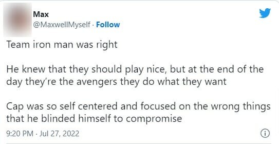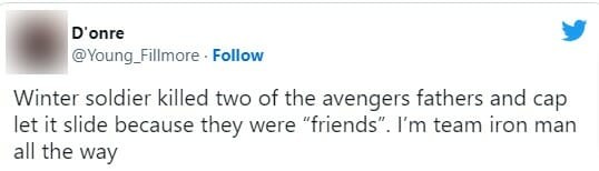 “Soldado Invernal matou dois pais de Vingadores e o Capitão deixou passar porque eles eram ‘amigos’. Sou time Homem de Ferro até o fim”, tuitou um fã.