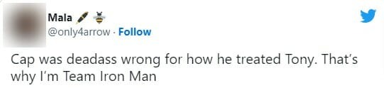 “Capitão estava completamente errado em relação a como ele tratou Tony. Por isso sou time Homem de Ferro”, disse outra fã.