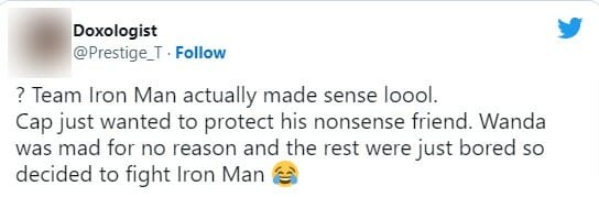 “Time Homem de Ferro faz sentido. O Capitão Só queria proteger o amigo sem noção dele. Wanda estava brava sem razão e o resto só estava entediado e decidiram lutar contra o Homem de Ferro”, disse outro fã.