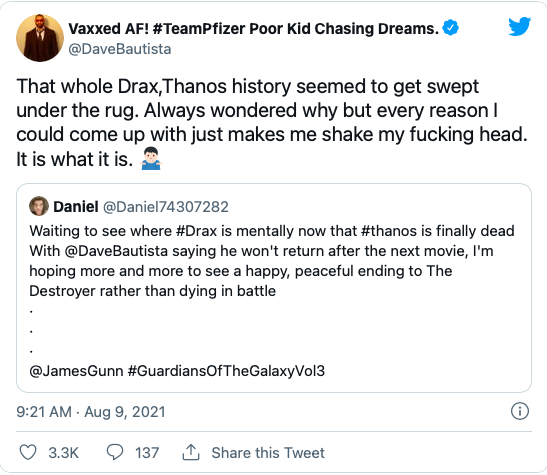 Mas, essa trama perdeu espaço por conta de todos personagens envolvidos em Vingadores: Guerra Infinita e Vingadores: Ultimato. Com isso, o fã publicou que queria saber onde Drax “está mentalmente com Thanos finalmente morto”.