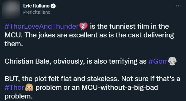 “Thor: Amor e Trovão é o filme mais engraçado do MCU. As piadas são excelentes, assim como o elenco as entregando. Christian Bale, obviamente, também é aterrorizante como Gorr. MAS, o enredo parecia simples demais e sem riscos. Não tenho certeza se isso é um problema do Thor ou do MCU”, apontou Eric Italiano, do BroBible