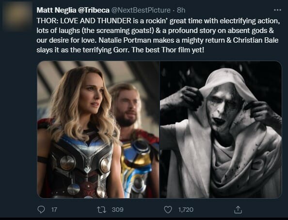 “Thor: Amor e Trovão é um ótimo momento filme com rock e com ação eletrizante, muitas risadas (as cabras gritando!) e uma história profunda sobre deuses ausentes e nosso desejo de amor. Natalie Portman faz um retorno poderoso e Christian Bale arrasa como o aterrorizante Gorr. O melhor filme de Thor até agora!”, elogiou Matt Neglia, do Next Best Picture.