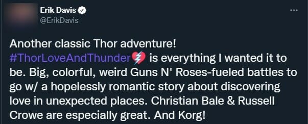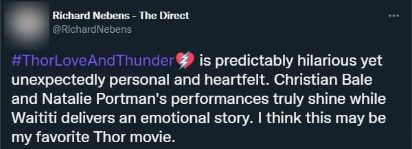 “Thor 4 é previsivelmente hilário, mas inesperadamente pessoal e sincero. As performances de Christian Bale e Natalie Portman realmente brilham, enquanto Waititi oferece uma história emocionante. Acho que este pode ser o meu filme favorito do Thor”, escreveu Richard Nebens, do The Direct.