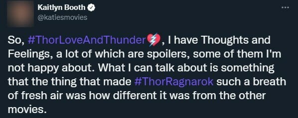 “Eu tenho pensamentos e sentimentos, muitos dos quais são spoilers, em alguns deles eu não estou feliz. O que posso falar é que o que fez de Thor: Ragnarok uma lufada de ar fresco foi o quão diferente era dos outros filmes”, disse Kaitlyn Booth, do Bleeding Cool.