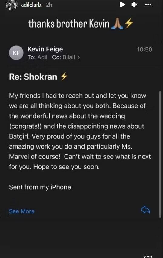 No stories do Instagram, o diretor de Batgirl, Adil El Arbi, compartilhou uma captura de tela de um e-mail enviado a ele e ao diretor Bilall Fallah por Feige.