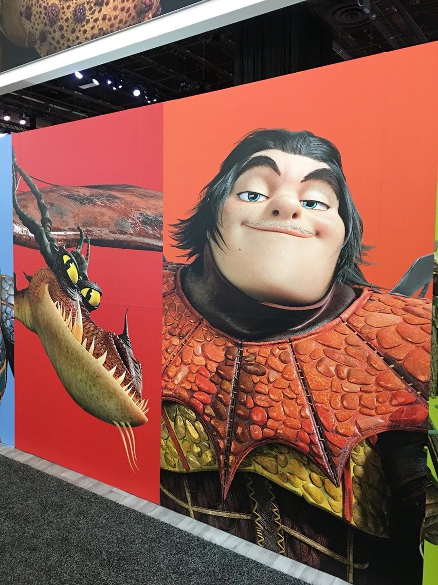 Nas fotos, vemos pôsteres exibidos na convenção de licenciadores, que mostram como os personagens principais da franquia, começando pelo protagonista Soluço, envelheceram.