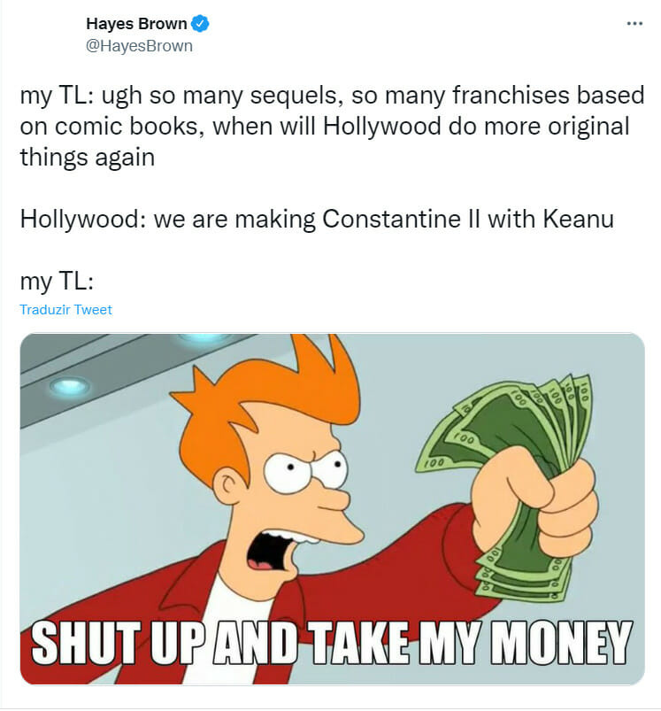 Outro fã postou um meme da animação Futurama e comentou: “Minha Timeline: nossa são tantas sequencias, tantas franquias baseadas em quadrinhos, quando Hollywood vai fazer mais coisas originais novamente. Hollywood: Nós estamos fazendo Constantine II com Keanu. Minha Timeline: Fica quieto e pegue o meu dinheiro.”