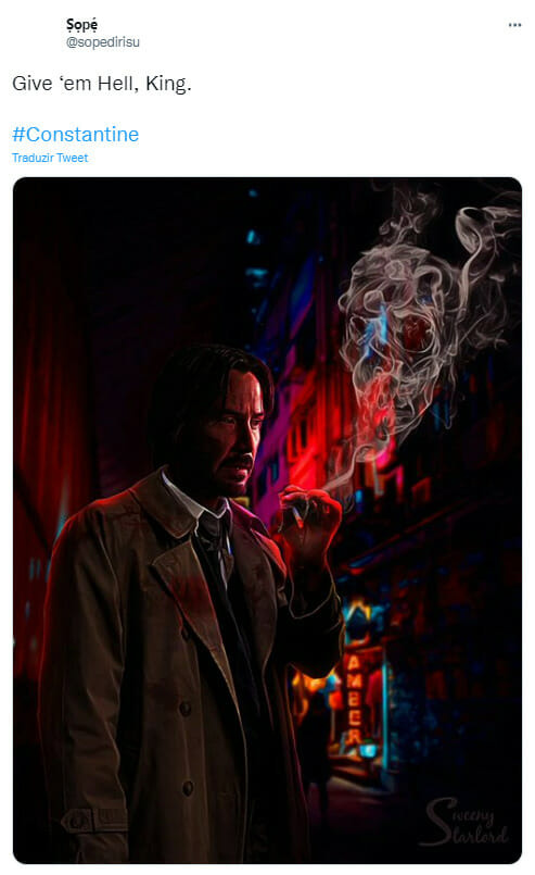 Outro fã postou uma arte incrível de Keanu Reeves com as roupas de Constantine e disse: “Dê o inferno à eles, Rei.”