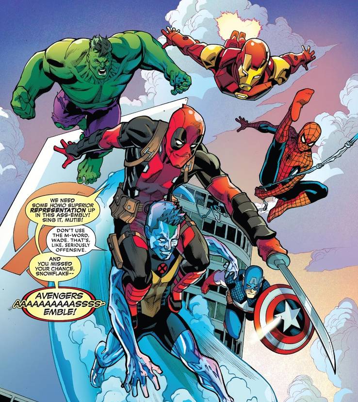 O mesmo cenário exato ocorre em uma linha do tempo diferente, mas com Homem de Gelo no lugar de Carol. Bobby Drake só saiu do armário nos últimos anos, mas isso funciona como um aceno perfeito para o status de décadas de Deadpool como um dos heróis bissexuais mais populares.